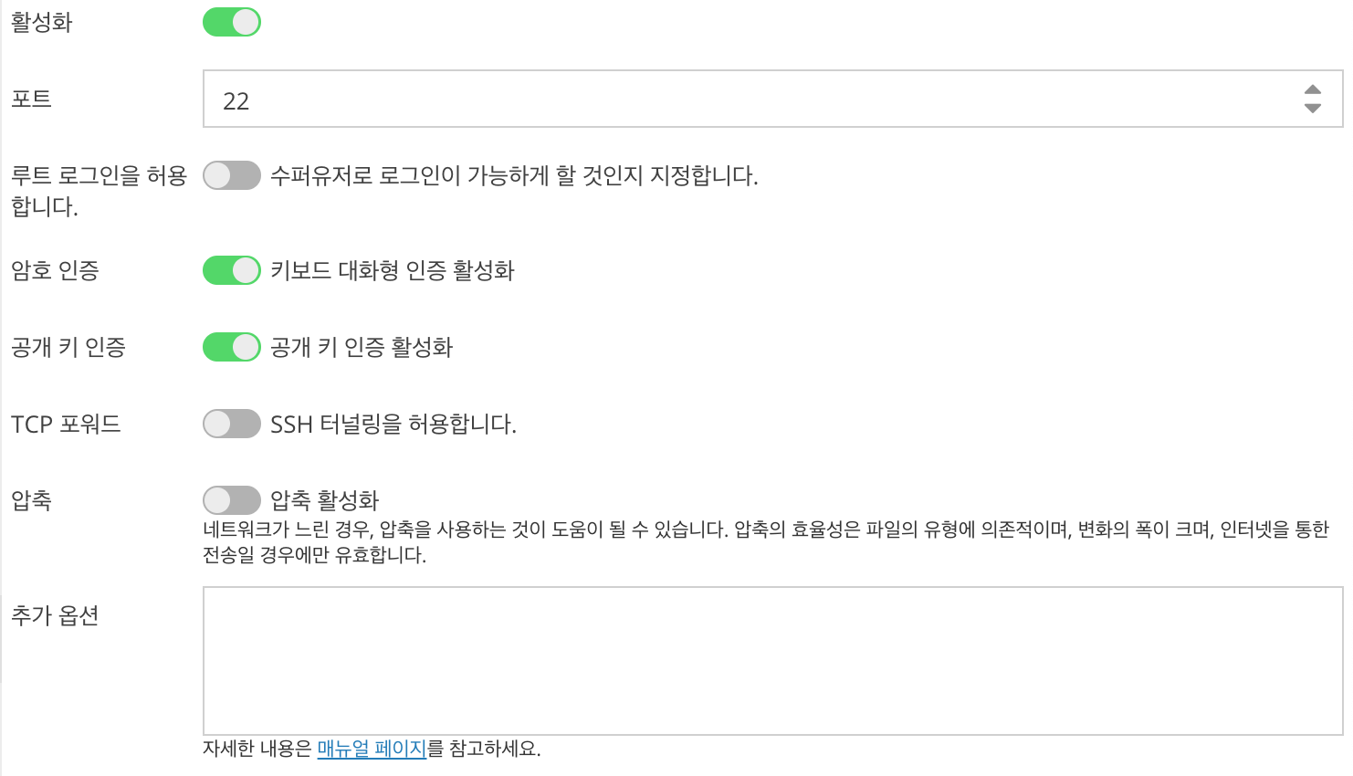 접속할 때 사용할 포트, 자동 로그아웃 시간 등을 설정할 수 있습니다.