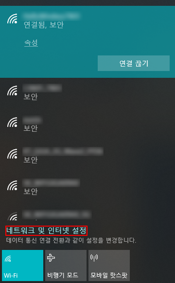 저기서 [네트워크 및 인터넷 설정] 버튼을 눌러서 설정을 열어줍니다.