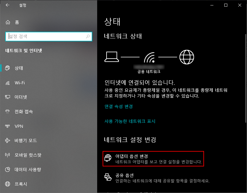 그래서 [어댑터 옵션 변경]를 눌러 제어판을 열어줍니다.