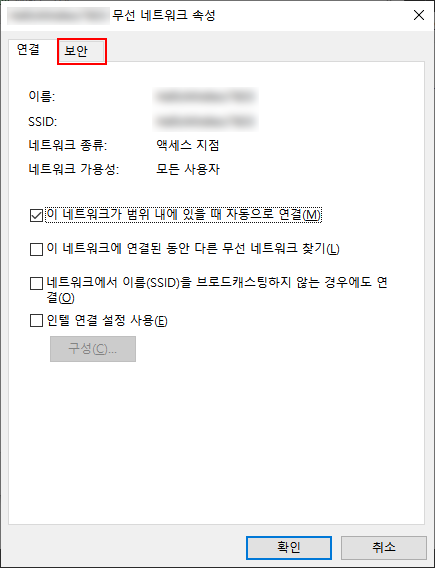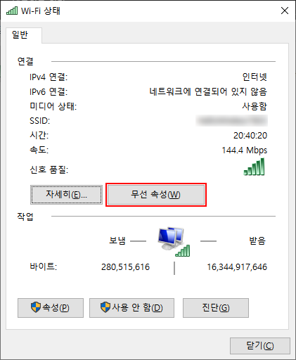 [무선 속성] 버튼을 누르면 현재 연결되어 있는 Wi-Fi의 정보를 확인할 수 있습니다.