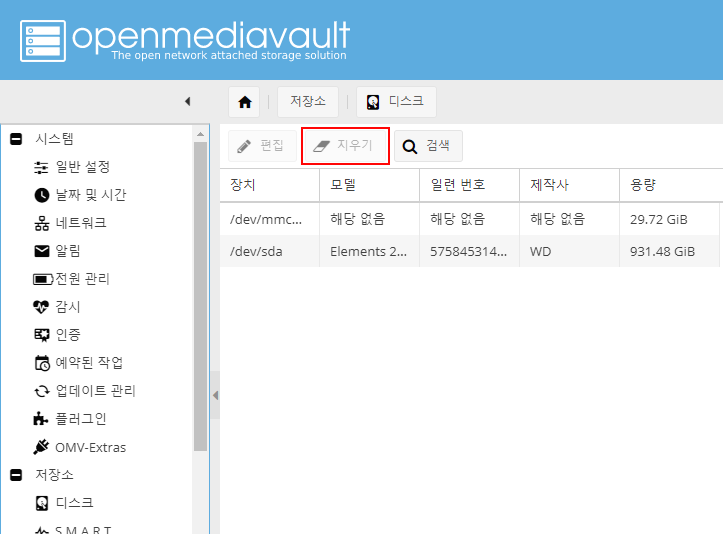 OMV 웹 설정 화면에 들어가서 [저장소] - [디스크] 로 들어가면 연결된 디스크들이 보입니다.